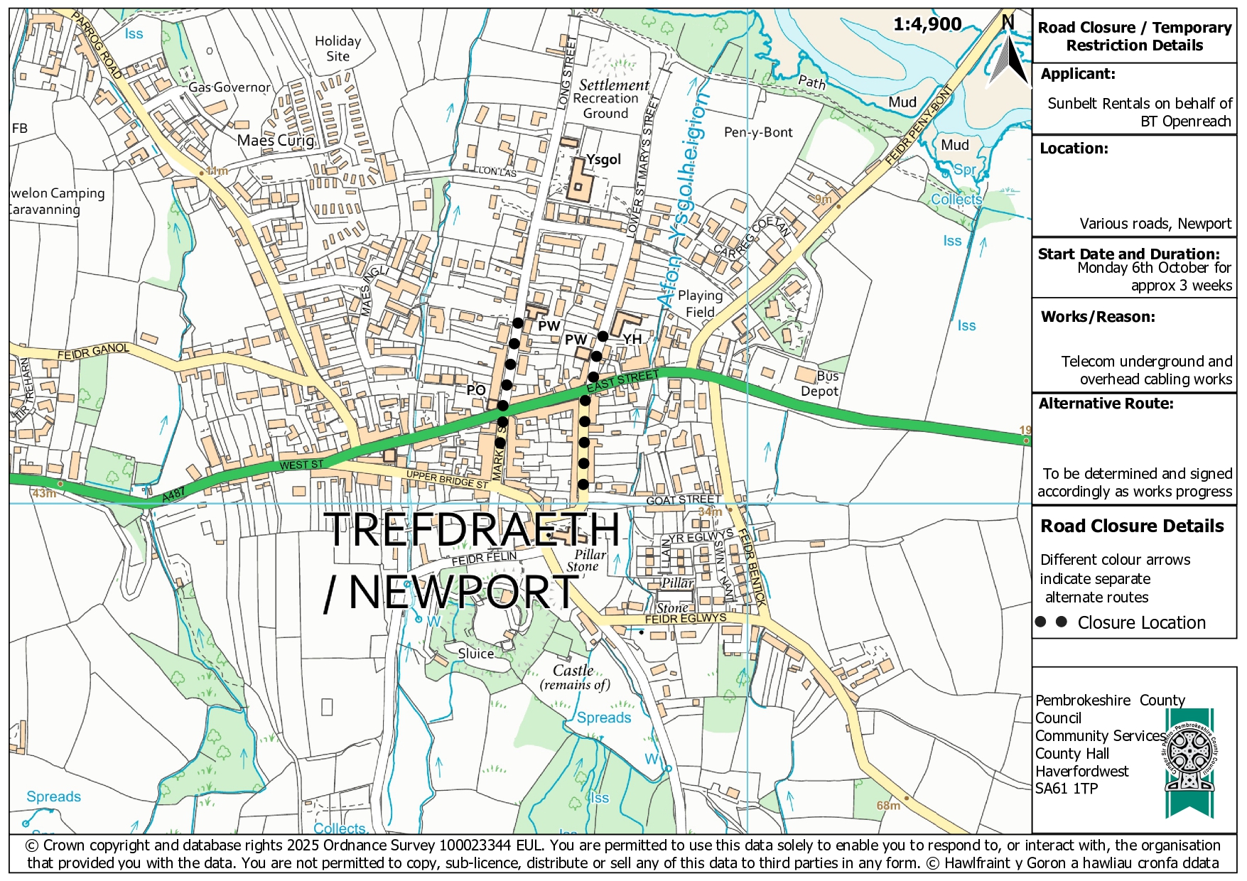 On those dates the A487 carriageway shall be closed between Parrog Rd and Market St, from 0900hrs to 1900hrs each Sunday. Whilst the closures are in place, there will be a temporary revocation of the one-way system along the Upper W St / Upper Bridge St, so that it be used as a temporary diversion route for local traffic with the use of two-way traffic lights. Please note this will only be suitable for cars and light good vehicles (less than 7.5T). All Trunk Road traffic will be diverted along the official Trunk Road diversion route, shown on the attached drawing.